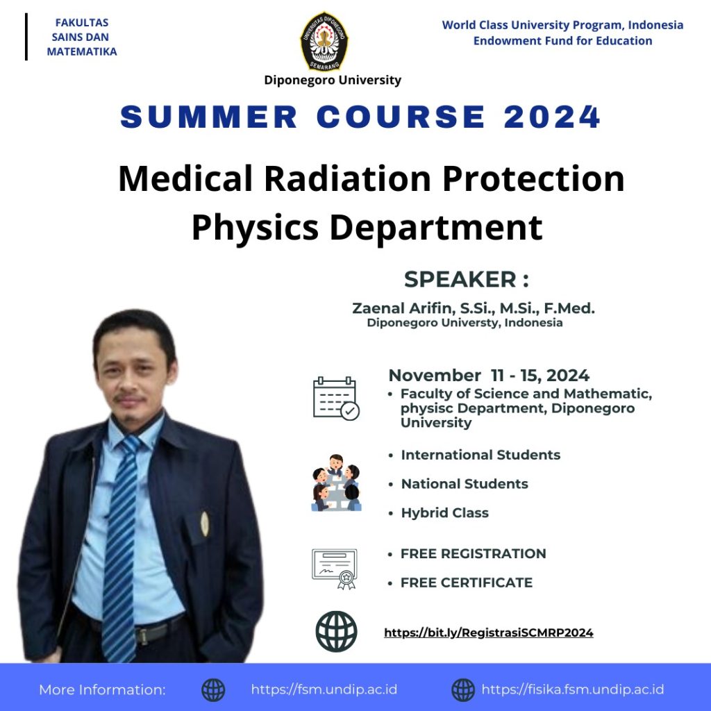 Kontribusi dalam mendukung program UNDIP dalam universitas kelas dunia, kita melaksanakan program WCU antara lain Summer Course “Medical Radiation Protection” yang akan dilaksanakan 11-15 Nopember 2024 di Fisika UNDIP.